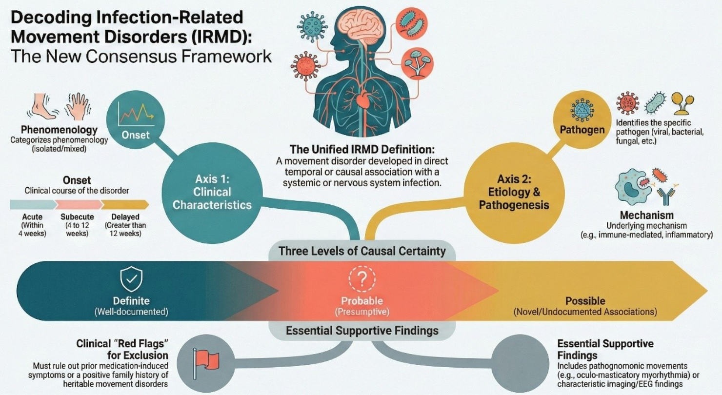 One of the study group's early contributions has been the development of a unified consensus framework for definition, diagnosis and axis-based classification of IRMD. This groundbreaking work establishes a standardized approach to defining, classifying, and diagnosing infection-related movement disorders. The framework also establishes three levels of causal certainty (Definite, Probable, and Possible) based on essential supportive findings, creating a standardized language that transcends geographical and institutional boundaries. This framework introduces a dual-axis classification system that provides clinicians with a structured approach to diagnosis. [Desai et al, PRD, 2024]. This framework has created a common language for clinicians worldwide.